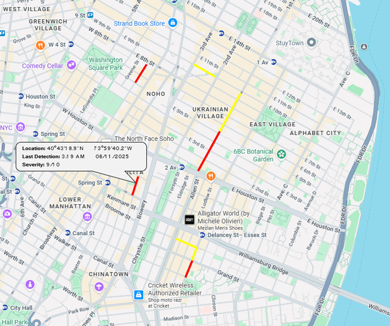 Our algorithms can identify when paint needs to be re-applied for sections of roadway. We offer accurate, timestamped paint quality maps of city streets, state & country roads, and federal highways.